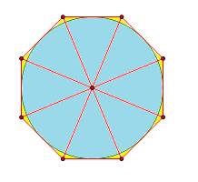 The area of this polygon is given by the formula \Pi=\frac{1}{2}bh\cdot{N} where N is the number of triangles. However, multiplying the base length of each triangle, b, by the number of triangles, N, simply gives us the perimeter of the polygon, P. This means that our formula becomes \Pi=\frac{1}{2}Ph. We can see, in Figure 3, that no matter how many triangles we make inside the circle, the perimeter of our polygon will be smaller than the circumference of the circle (P<C) and the height of the triangles will be less than the radius of the circle (h<r), so we can conclude that \frac{1}{2}Ph<\frac{1}{2}Cr. No matter how many sides the polygon has, its area will still be smaller than T. It is impossible to create a polygon inside the circle which has an area equal to our right triangle. This means that the right triangle from Figure 2 cannot possibly have a smaller area than the circle.