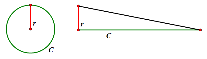 So, now we have determined that T cannot be smaller than the area of the circle, nor can T be larger than A. Therefore, we must conclude that T=A; that is to say, the area of a circle with radius r and circumference C is equal to the area of a right triangle with legs of length r and C. So, that means that A=\frac{1}{2}Cr. Of course, we still have a problem: we don’t know the value of C, nor a method for calculating it.