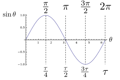 Look at how much more naturally τ measures the Sine wave than does π! Just like we saw in the angular measurement, above, it is much easier to discuss the period of trigonometric waves in terms of τ, which makes these things far easier for teachers to teach and for students to understand. The sine wave measures properties of a unit circle. The maximum value of \sin\theta is the radius r, and the period of the wave is the circumference C. This makes far more sense when we are using a circle constant which is directly in terms of C and r, like τ, than one which is in terms of C and d, like π.