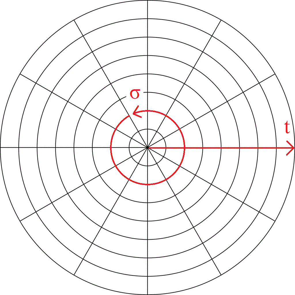 If the usual Cartesian plane makes for an inadequate or confusing model of space-time, might there be a better model available to us? Let’s look at another type of two-dimensional graph, one which is somewhat less familiar. Now, I’ll fully admit that this is certainly not a perfect model for modern cosmological understandings of space-time, but it does provide a coherent example of a system in which time has some initial point. This is a two-dimensional Polar Graph. The displacement, , from the center point of the graph– that is, the pole– represents our dimension of time; while the angular rotation,