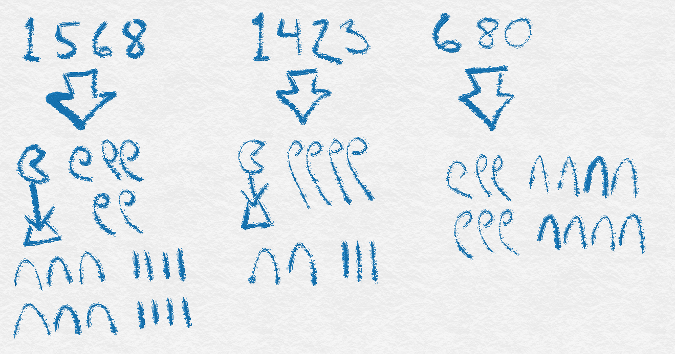 The hieroglyphs, in ascending order, represent a stalk of grain, a cattle hobble, a coiled rope, and a lotus flower. You’ll notice that there’s no symbol for 2 or 3 or 4, et cetera. When the Egyptians wanted to write such numbers, they would simply repeat one of their other symbols. So, for example, when an Egyptian wrote the number 4, he would write four strokes, ||||. If he wanted to write the number 34, he would write ∩∩∩||||, and so on. Thus, the numbers from the video would be written as follows: