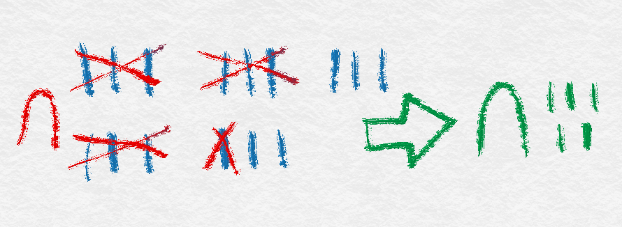 Once we have written out these five groups of three, all that remains is to count them all up for a total. Just as in the previous article, when we count up ten of the 1’s numeral, we scratch them off and replace them with a 10’s numeral. The remaining symbols are our solutions.