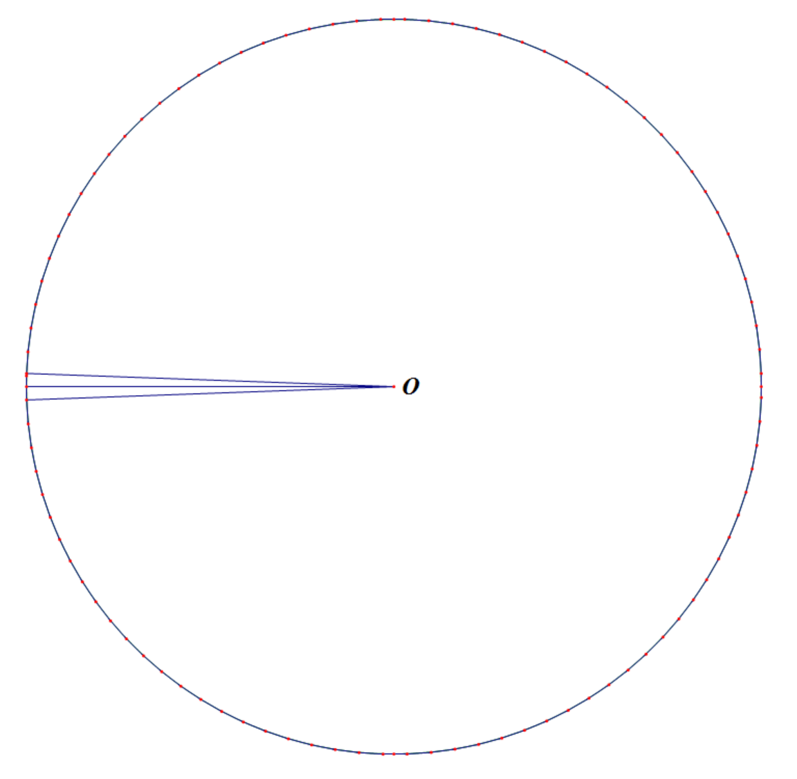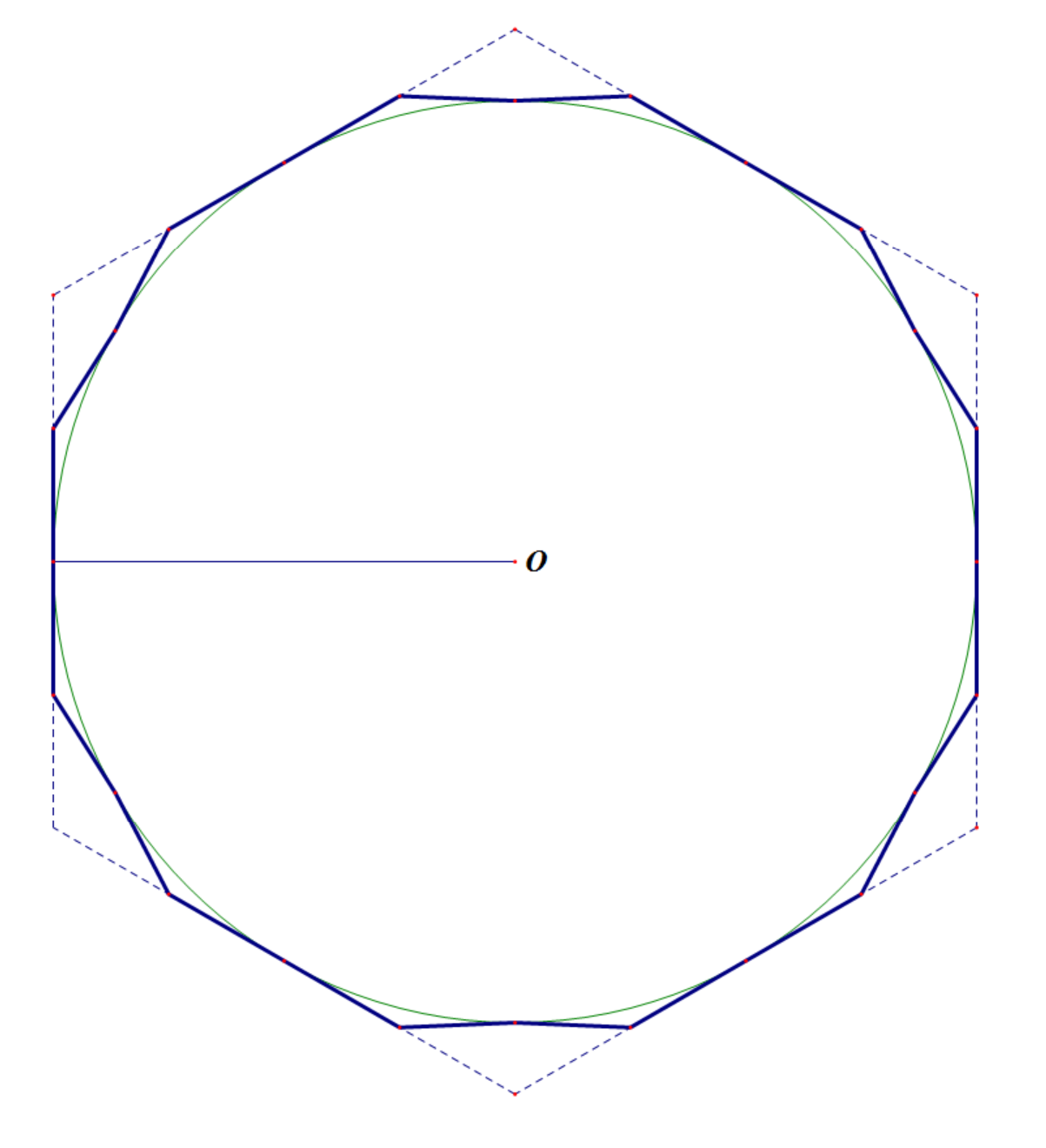 In Figure 2, we’ve constructed a regular dodecagon (12-sided polygon) whose apothem is equal to the circle’s radius, centered on point O. As you can see, its perimeter is much closer to the circumference of the circle than was the hexagon’s. Still, it is immediately apparent that the perimeter of the dodecagon must be greater than the circumference of the circle due to the clearly visible distance of the vertices from the circle. If we again double the number of sides, drawing an icosakaitetragon (24-gon), we’ll notice that the vertices come even closer to the circle. Archimedes performed his famous calculations on the circle using nonacontakaihexagons (96-gons), which would look like Figure 3, below.