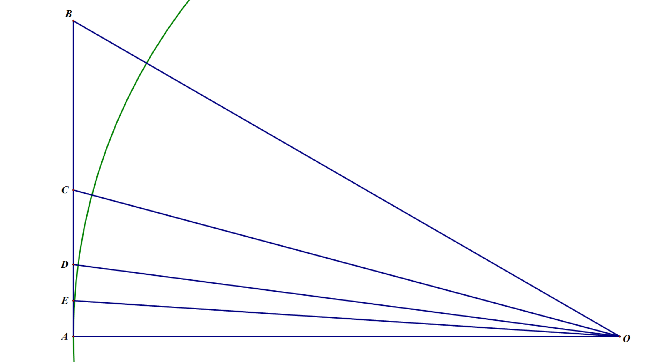 In Figure 4, I’ve zoomed in on a diagram which will aid in our calculation. In this diagram, O is the center of the circle. The segment is the radius of our circle, and will also be the apothem of our infinigon. The segment