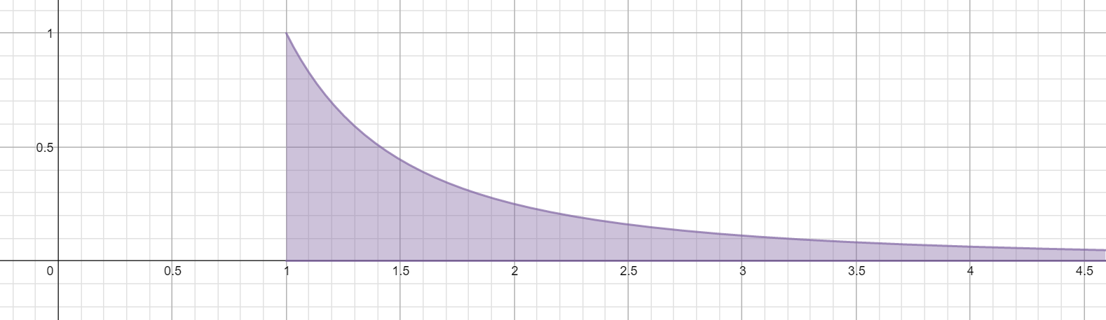 Let’s take a very, very basic example. Let’s say that I am presented with the integral \int_1^\infty \frac {1}{x^2} dx, and asked to evaluate the expression. This is a very simple problem which most students will encounter when they are first introduced to Integral Calculus. Now, let’s take a look at what this expression represents. In Figure 1, below, I have graphed the function \frac{1}{x^2}, for x\geq 1, as the dark purple curve. The shaded region underneath the curve is the value which we are attempting to calculate with the integral \int_1^\infty \frac {1}{x^2} dx. We are trying to determine the area of this region.
